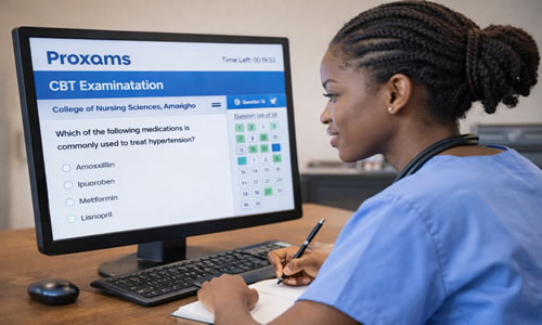 The College utilizes Proxams CBT software for examinations. The system supports multiple question formats including multiple-choice questions (MCQs), subjective questions, and CAOSCE/practical-based assessments.